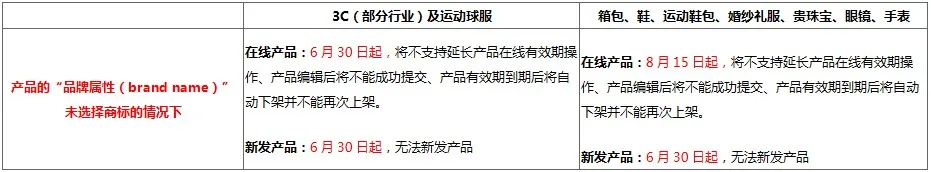 同时,这几个类目下若产品的“品牌属性”未选择商标,平台将在6月30日开始分批执行以下操作: